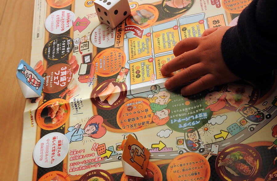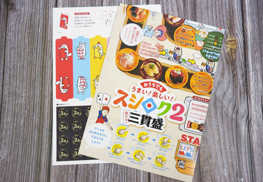 「スシロー手巻セット」の他に、すごろくやお皿飛ばしゲームもついてきました。紙製のサイコロやコマ、皿チップもついていますよ。すごろく(スシロク2)は、サイコロをふってコマを進めていき、すし皿を集めていきます。ゴールの地点ですし皿が多い人が勝ち。