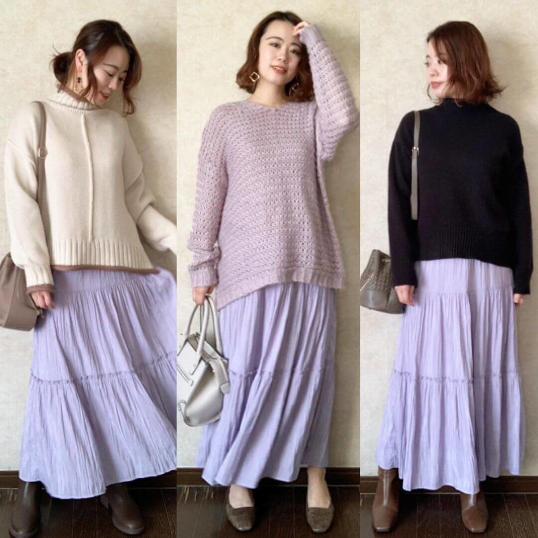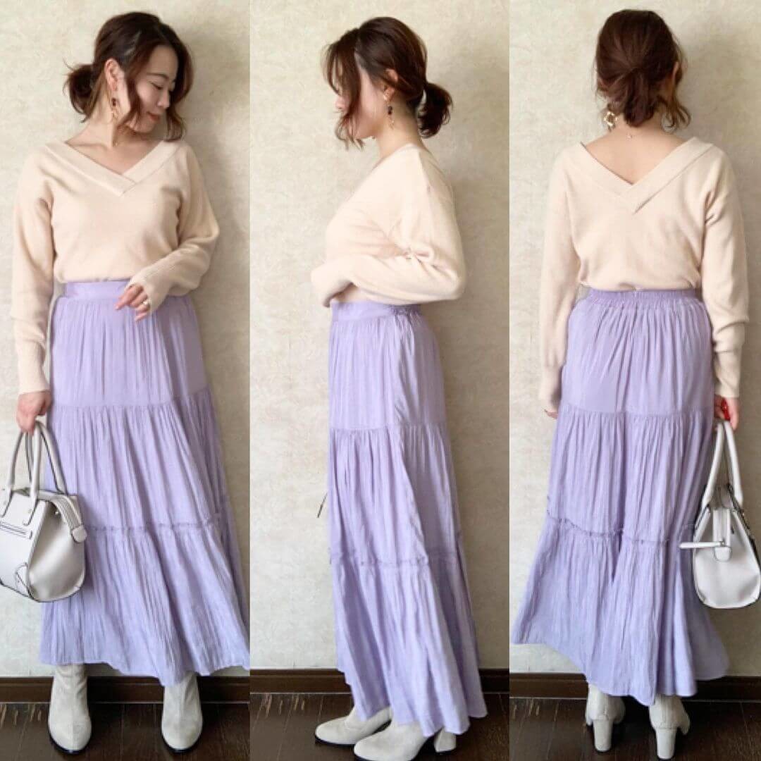 春コーデの主役になってくれるラベンダーカラーのスカート。淡いパステルタッチな色味によって、清らかな雰囲気を引き出せますね。