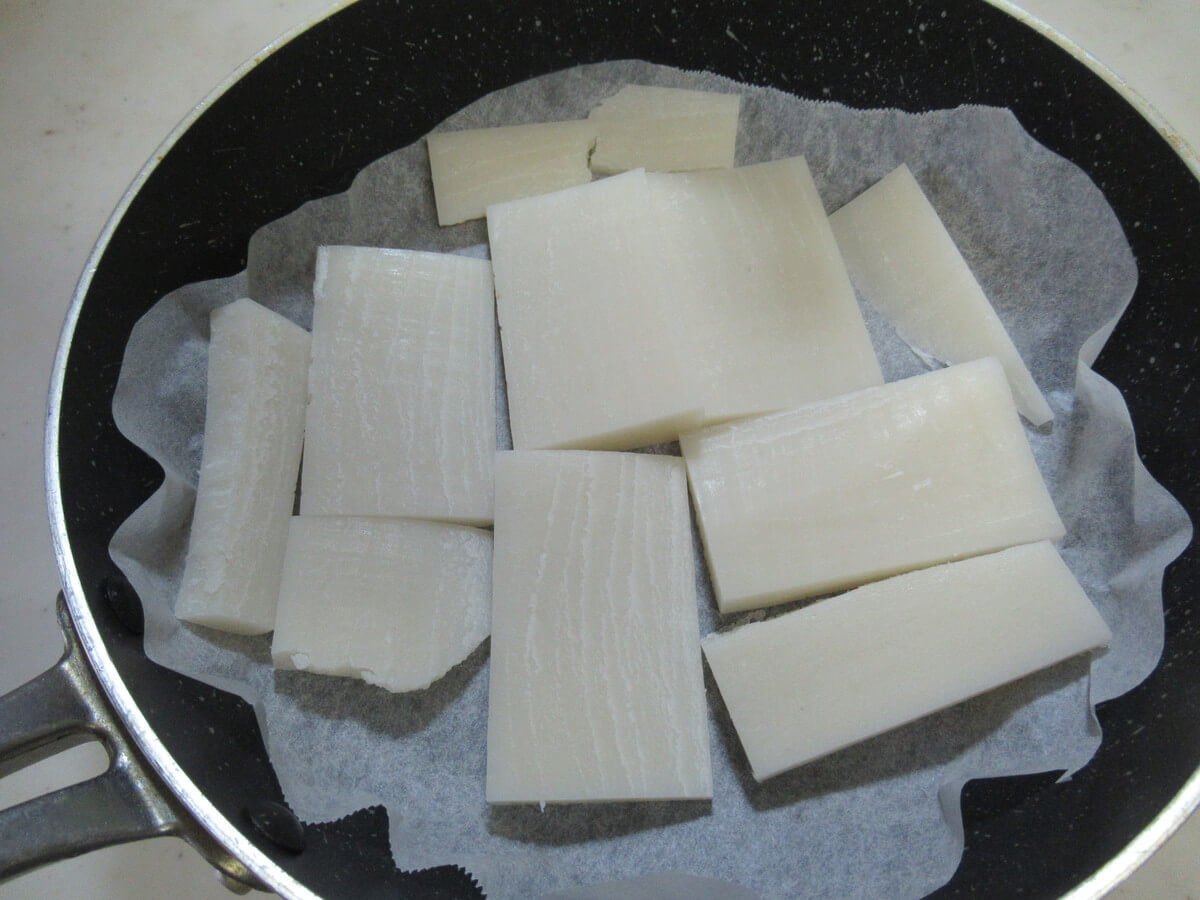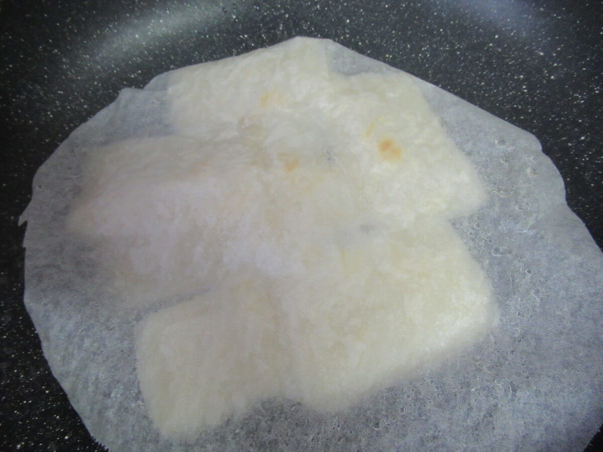 このとき、クッキングシートを引かないとフライパンにおもちがくっついてしまいますのでご注意ください。