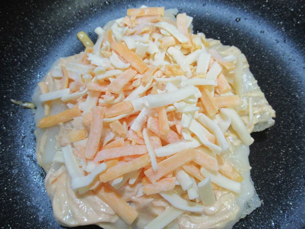 7.とろけるチーズを乗せて蓋をして、チーズが溶けるまで中火で加熱する