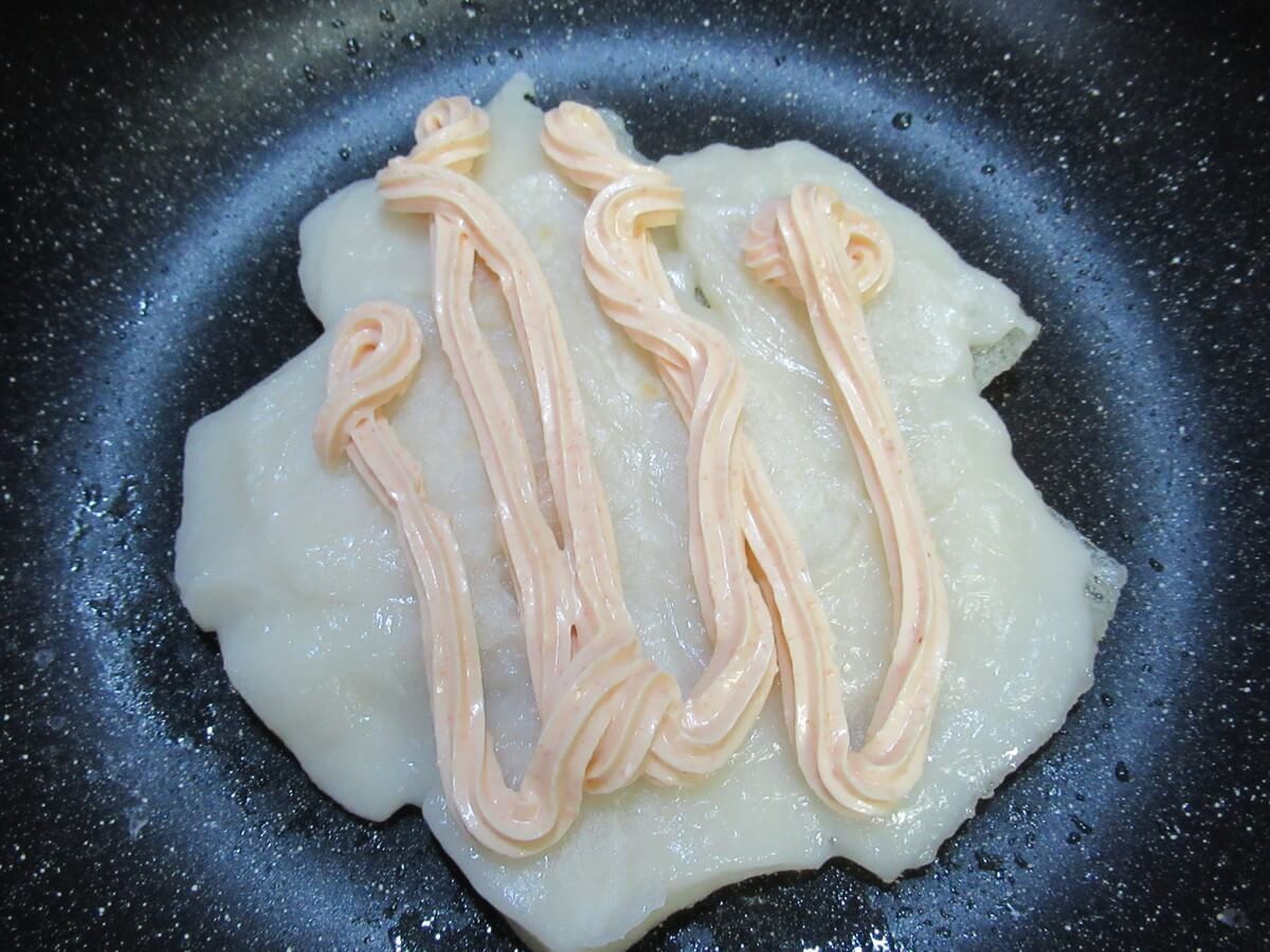 6.クッキングシートをはがして、めんたいマヨソースを塗る