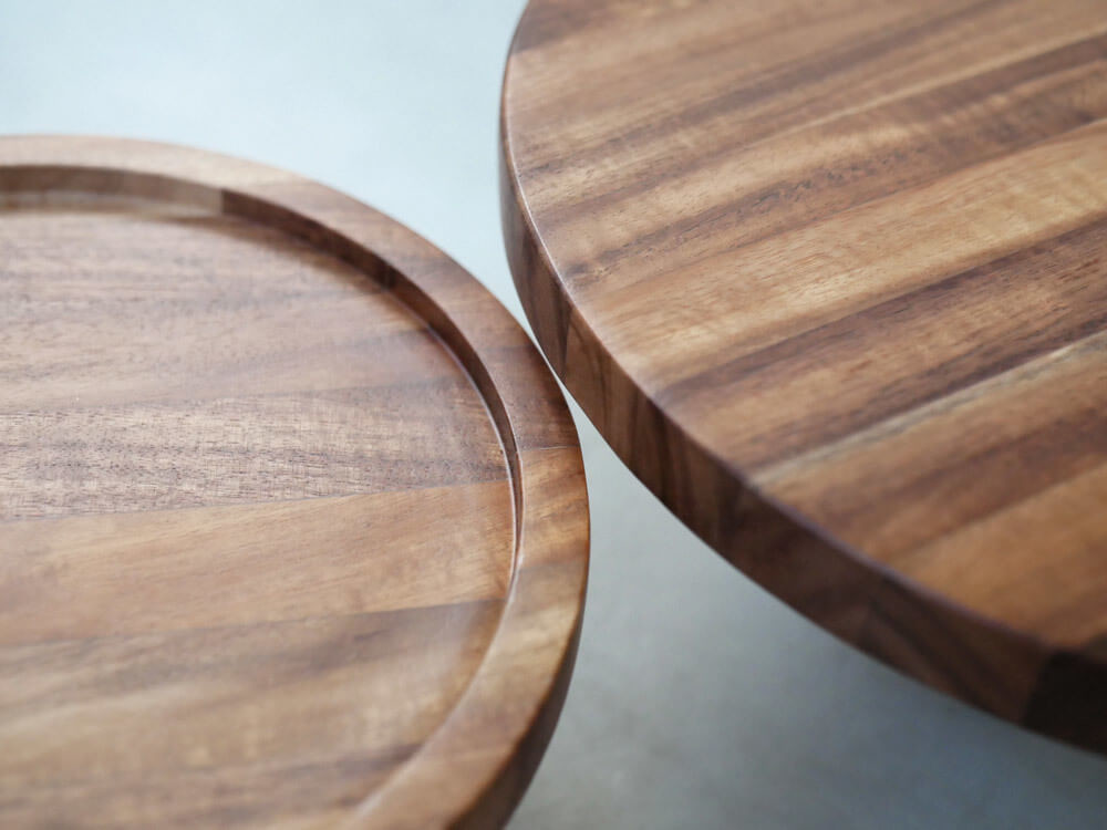 XS・Sサイズには、小物をディスプレイする際に滑り落ちにくいフチつき。M・Lサイズは、ケーキなどのサービングがしやすいようフラットになっています。