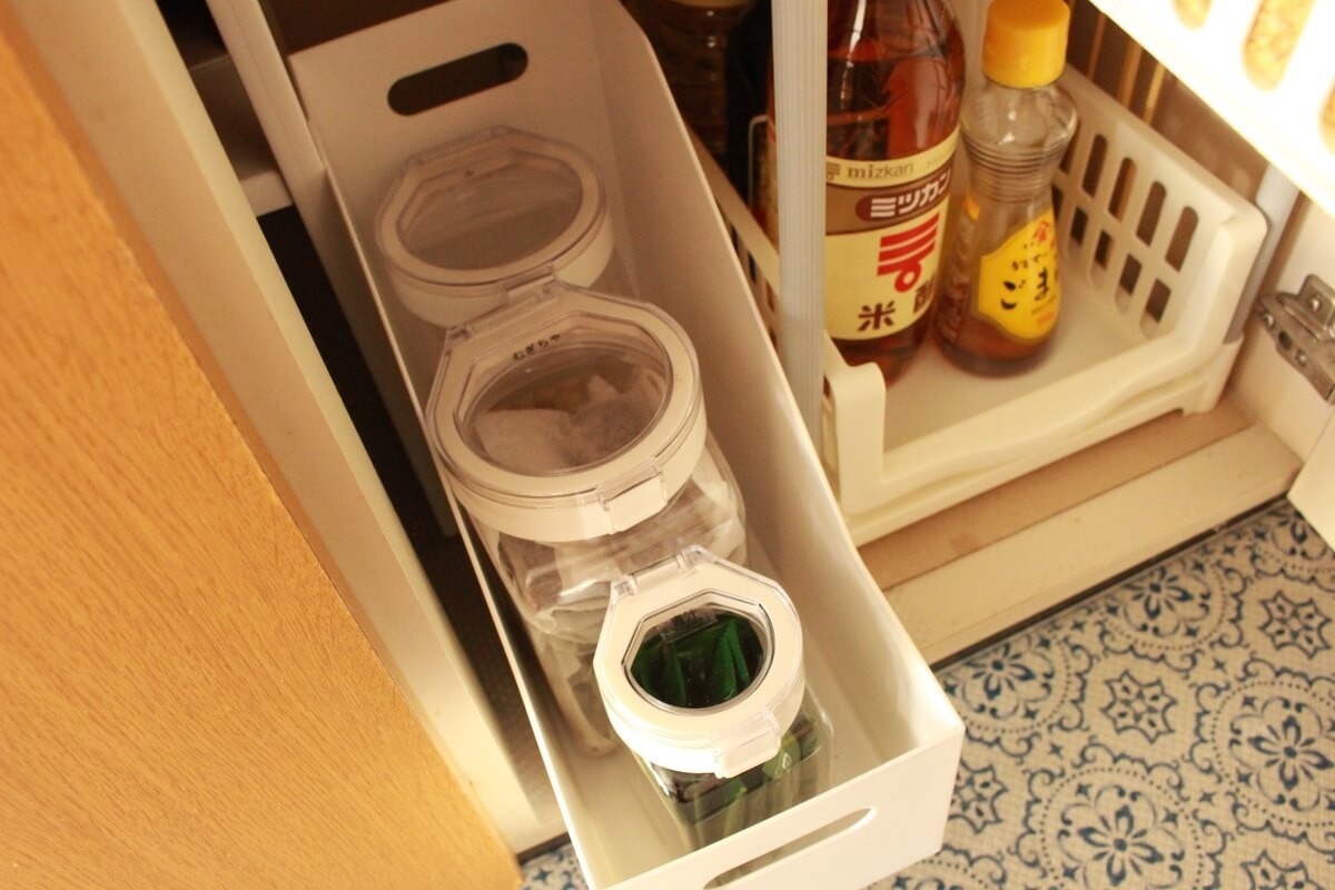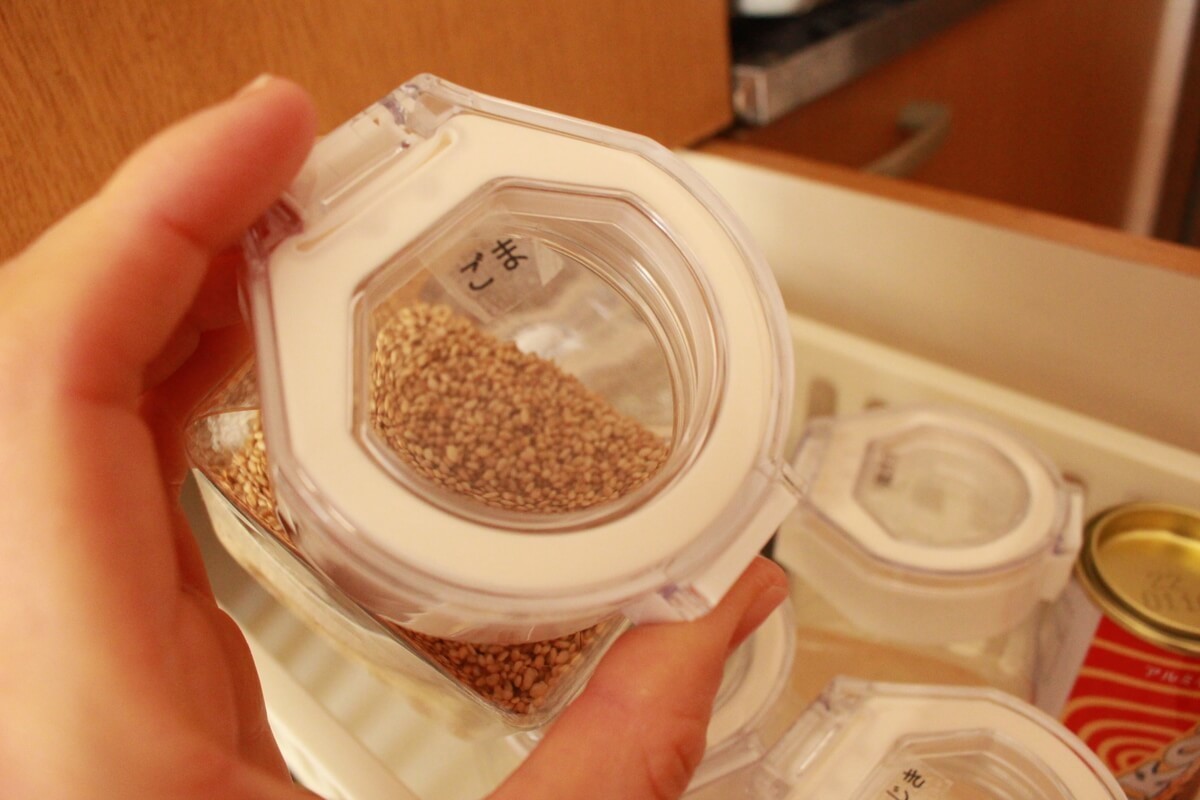 わが家は、ガラス瓶に入れてコンロまわりに置いていましたが、統一感もなくだんだん油汚れがつきプチストレスでした。