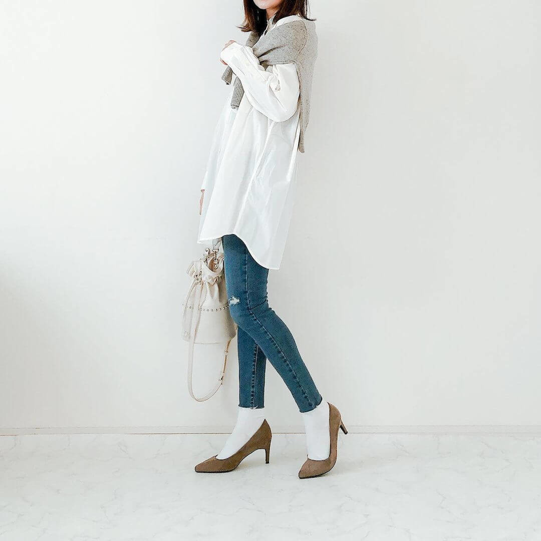 一つ前のコーデに肩掛けニットをプラスして、重心をアップ。