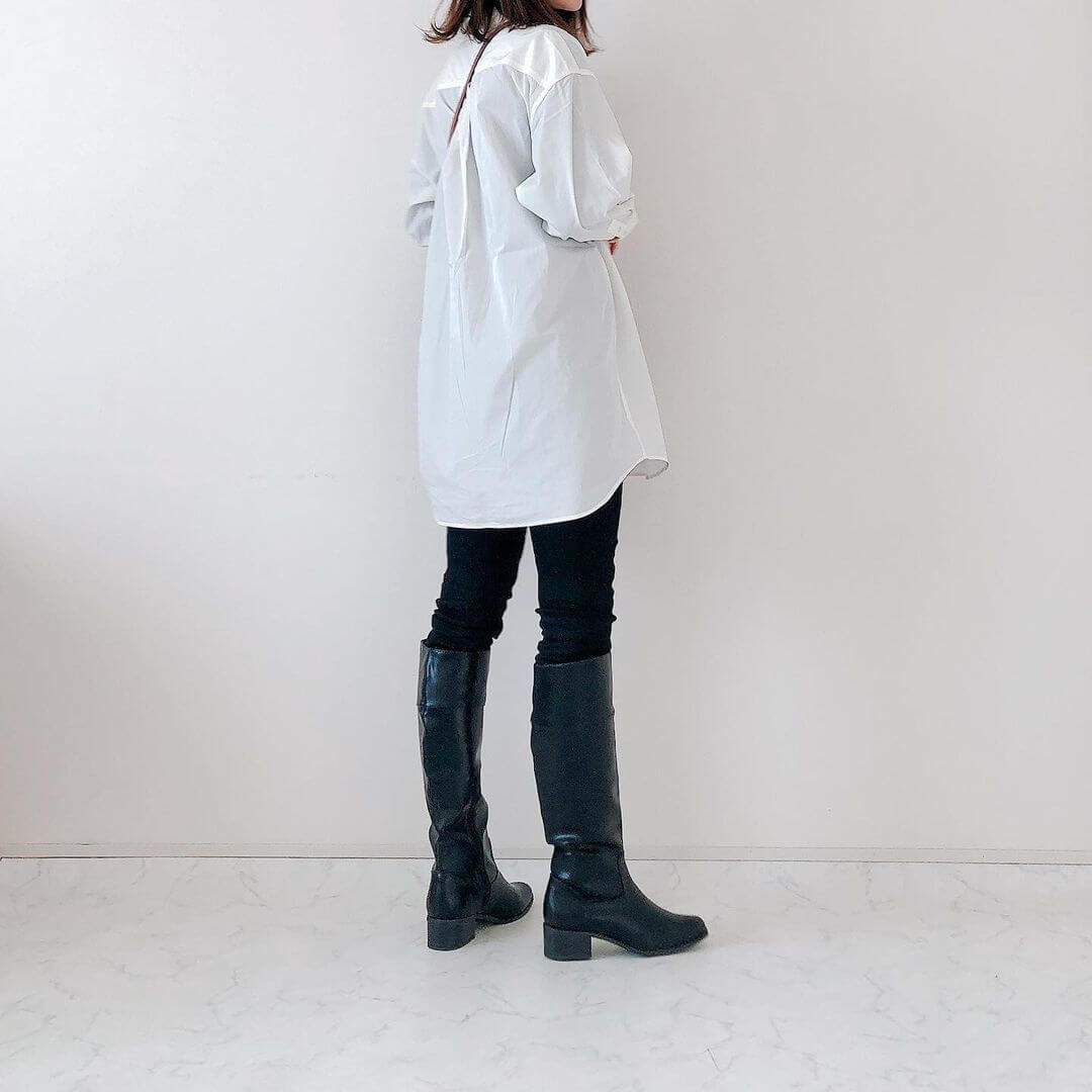 黒スキニーとコーディネートして上下のコントラストを付けると、華奢なレッグラインがより際立って見えます。
