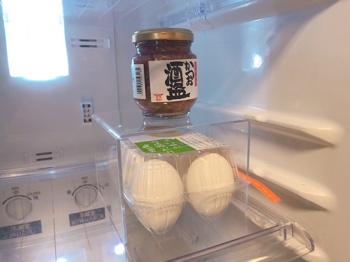早速卵パックを下のスペースに使用してみると、気持ちいいぐらいにピッタリ!縦にもう1つ重ねる事もできます。我が家の冷蔵庫内の横幅は約35cmで、ディスプレイスタンドは横に2個並べられました。