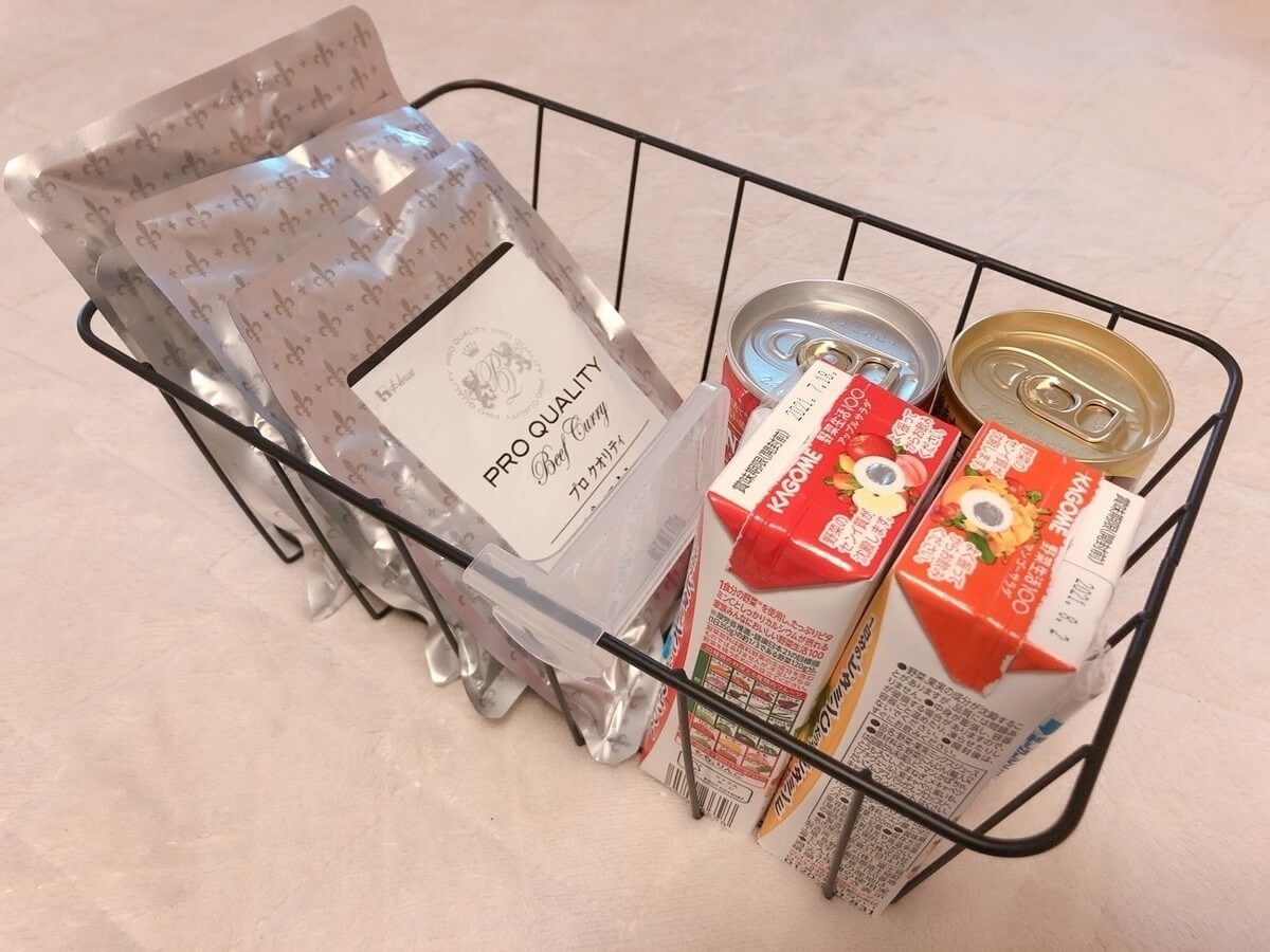 こちらは2番目に大きいワイヤーバスケットです。缶コーヒーやパックのジュースなどをまとめて入れると丁度よく収納できます。