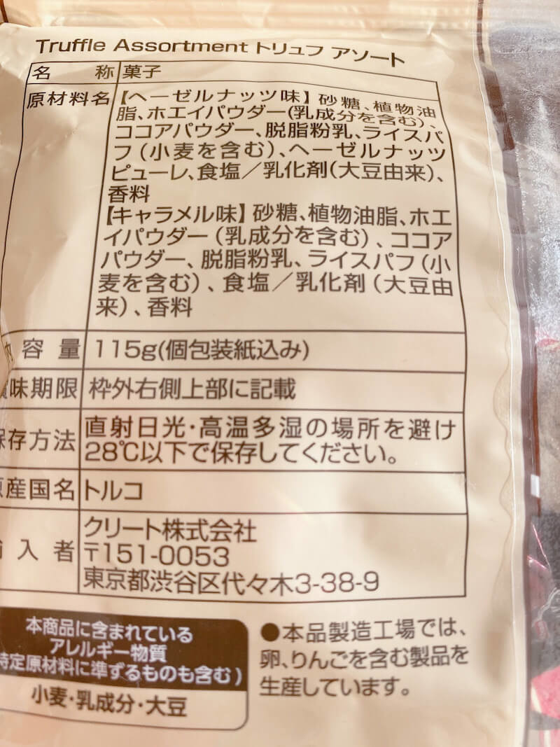 トルコ産のトリュフで 内容量は115gと記載されていますが 10個入りでした。
