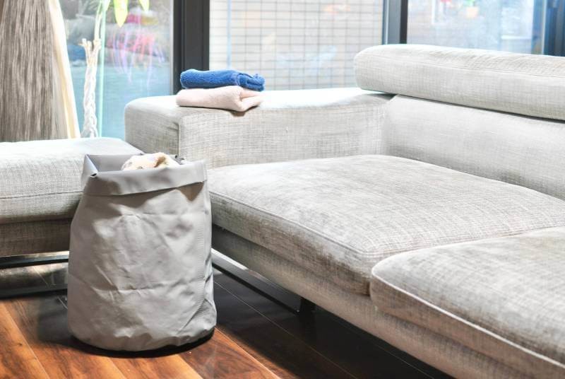 ソファの色と合わせてグレーを選んだから、洗濯物を片付けなくても部屋がスッキリして見えます。