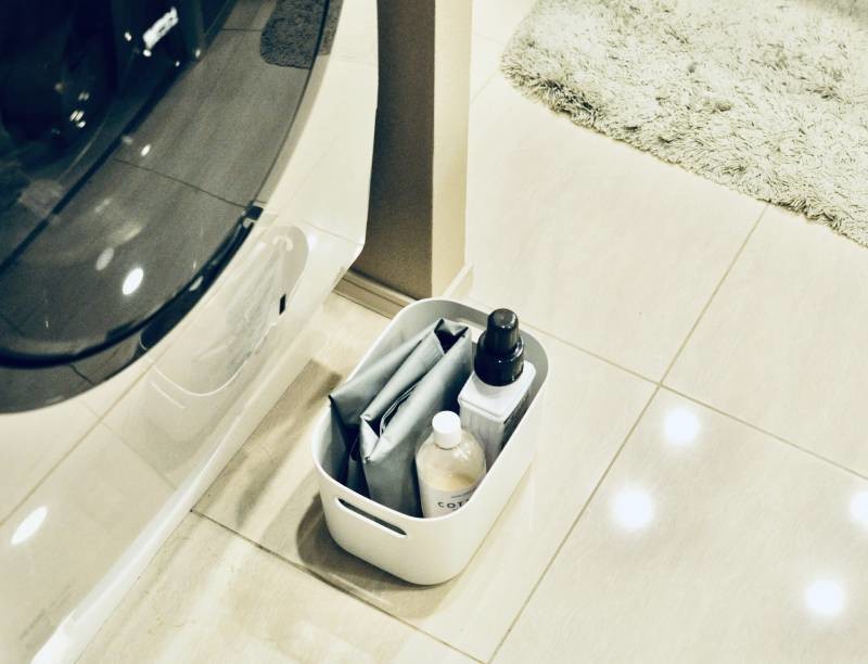 使わない時は畳んで収納。35リットルも入るのに、たたむと洗剤ボトルよりもコンパクトに。以前は、洗濯物を片付けた後に洗濯物入れカゴを持て余していたので、これは助かっています。