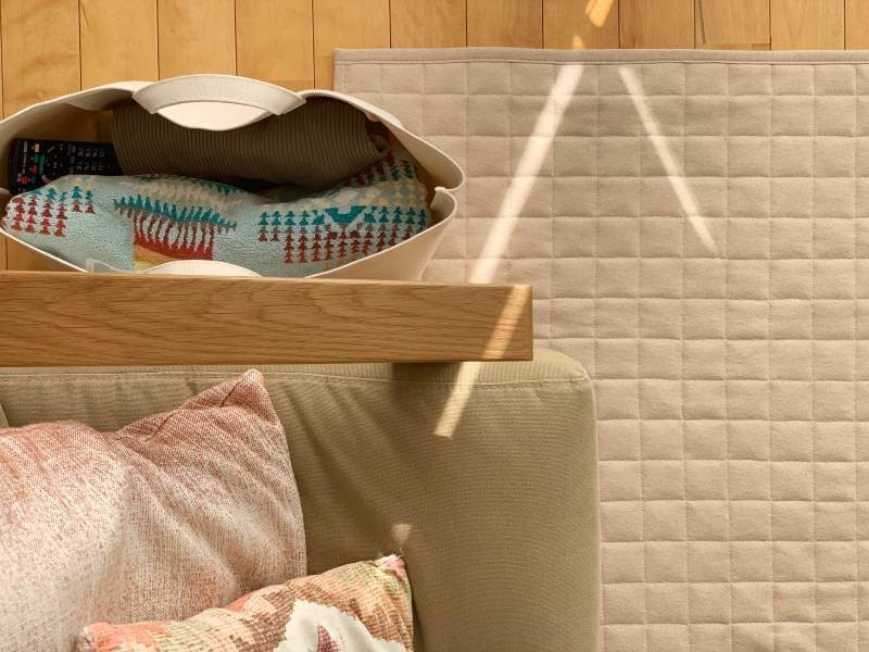 朝、子どもがソファーで二度寝する時に引っ張り出して使うブランケットと、いつも出しっぱなしにされるリモコンをひとまとめにし、ソファーからの最短距離収納を実現。