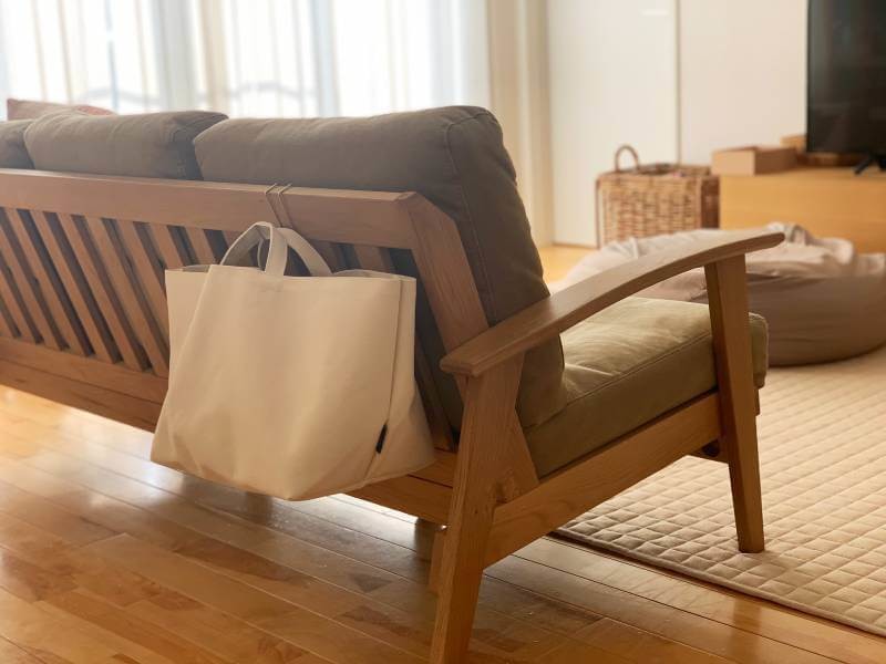 直置きももちろんかわいいのですが、わが家はソファーの背もたれを利用して、引っ掛けて収納。