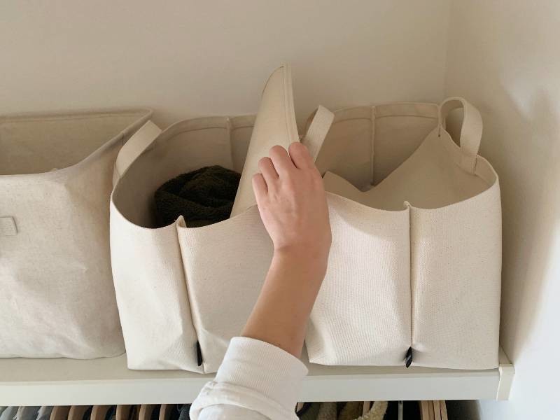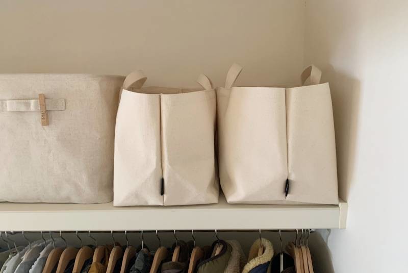 「目隠しできる帆布素材の収納トート」なら、フラップで埃避けをしながら、開け閉めの動作が簡単なので、中身を確認しやすく、すぐに取り出せます。