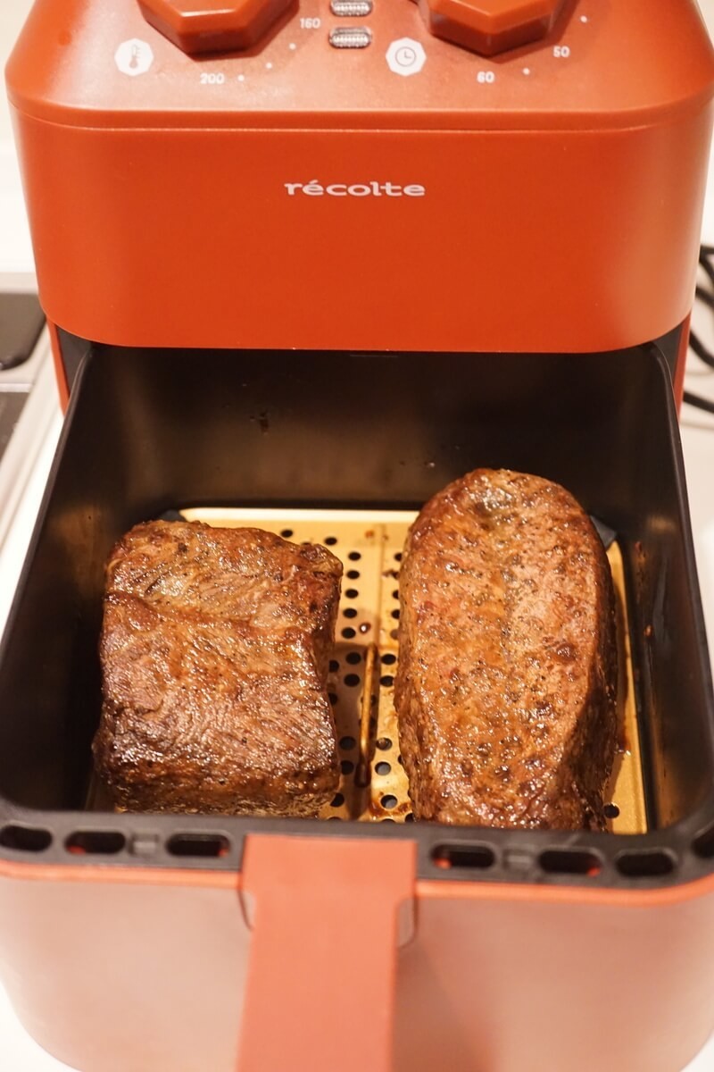 内アミの真ん中に取っ手があることと、エアーオーブンの熱量を考えると、ローストビーフを作る際は大きいサイズを1個ではなく、300~350gのブロックを2個作るのがおすすめです。