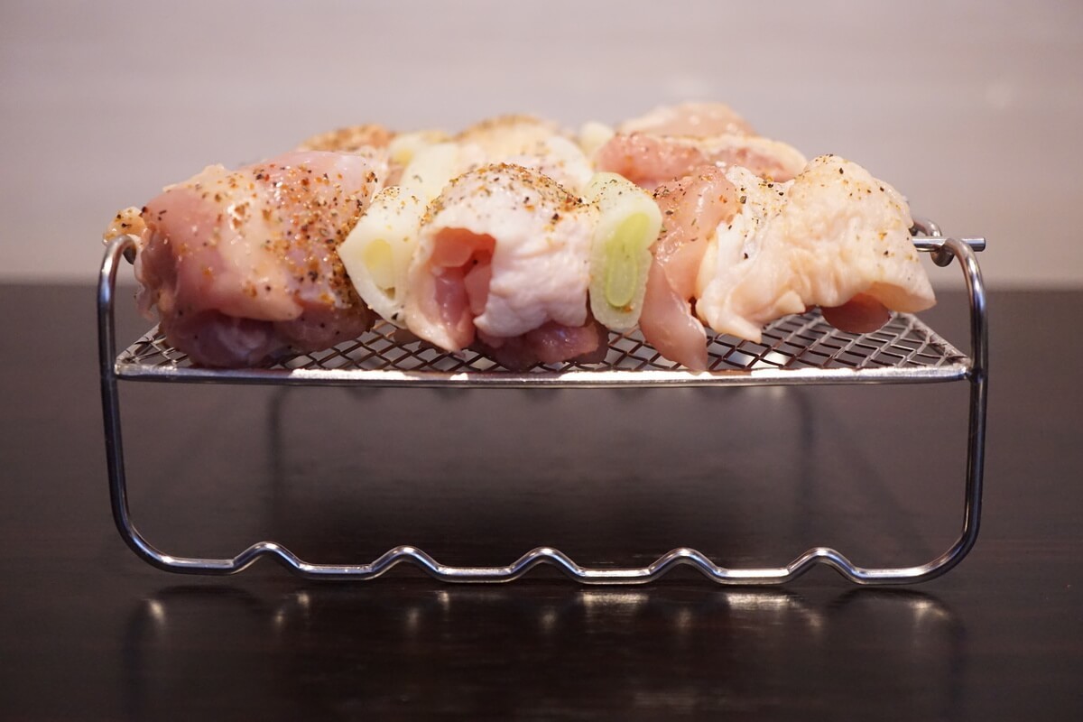 ステンレスの串は2ウェイラックに5本セットすることができますが、お肉を二口大の大きさにカットすると一度に調理できる焼き鳥は3本までとなります。