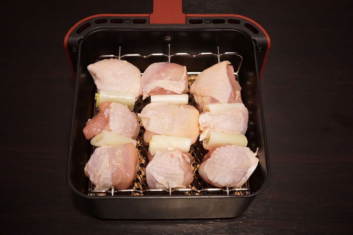 - 予熱が終わったらバスケットを取り出し、焼き鳥を入れます。