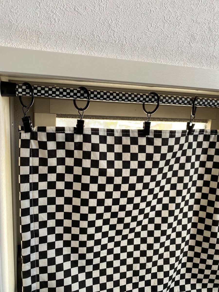 ちなみに、このチェッカー柄のつっぱり棒も以前セリアで買ったモノです。