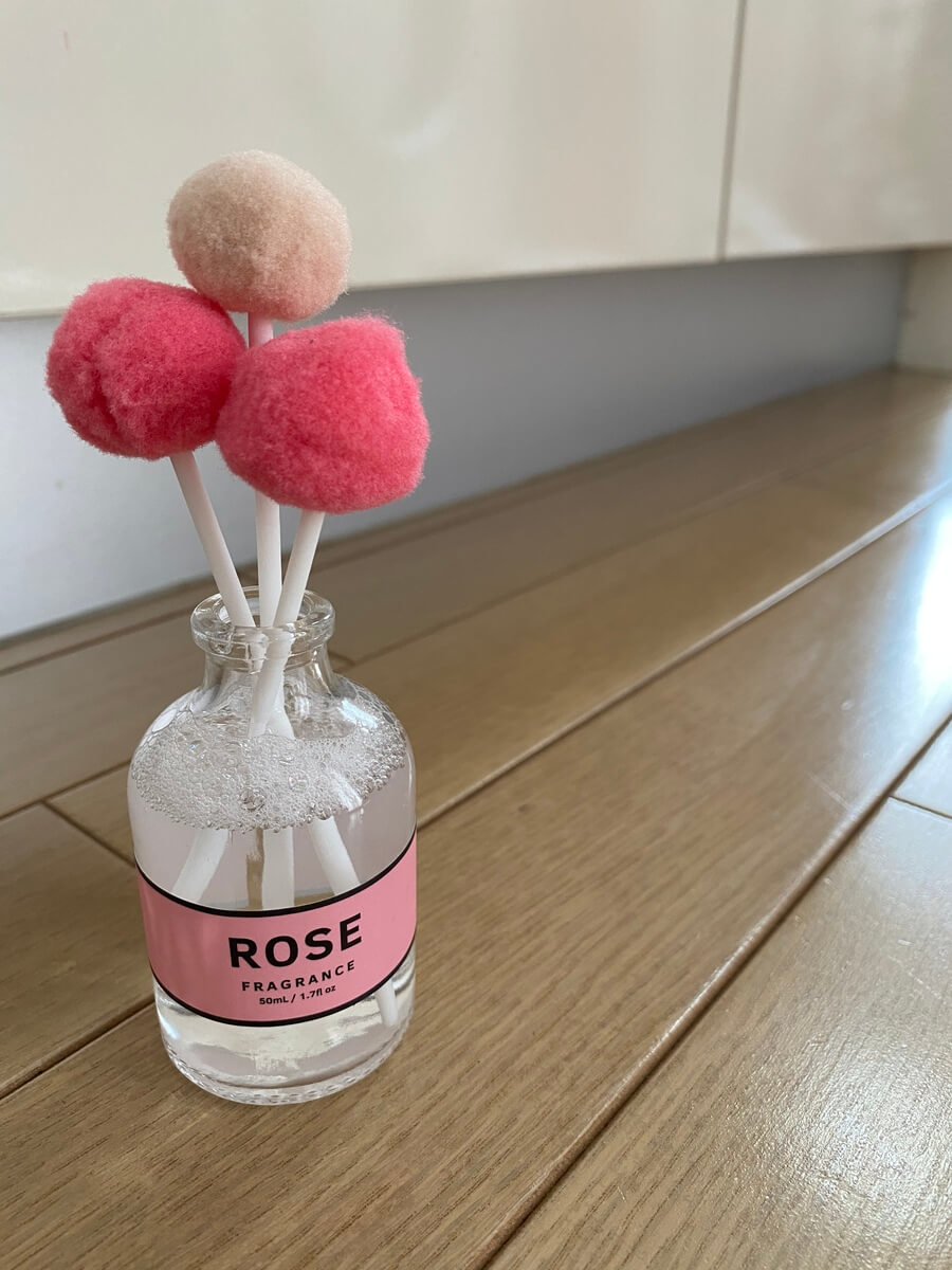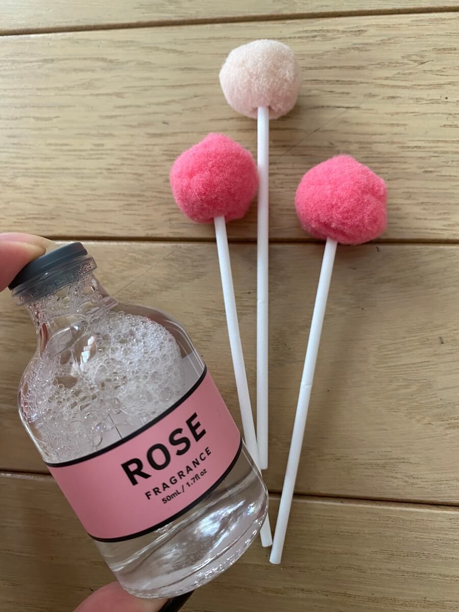 3本のスティックの先に可愛いピンクのボンボンが付いています。 今まで、スティック状のアロマディフューザーは見たことがありましたが、ボンボン付きは初めて発見!