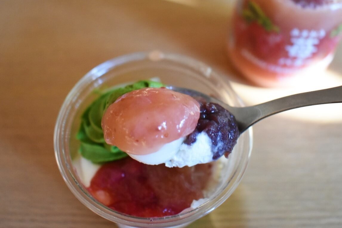 もともと苺の赤いソースがのっていますが、抹茶+小豆餡+苺が好きで何度かこの商品を食べた筆者は「いちご感が足りない」と少し不満に思っていました。