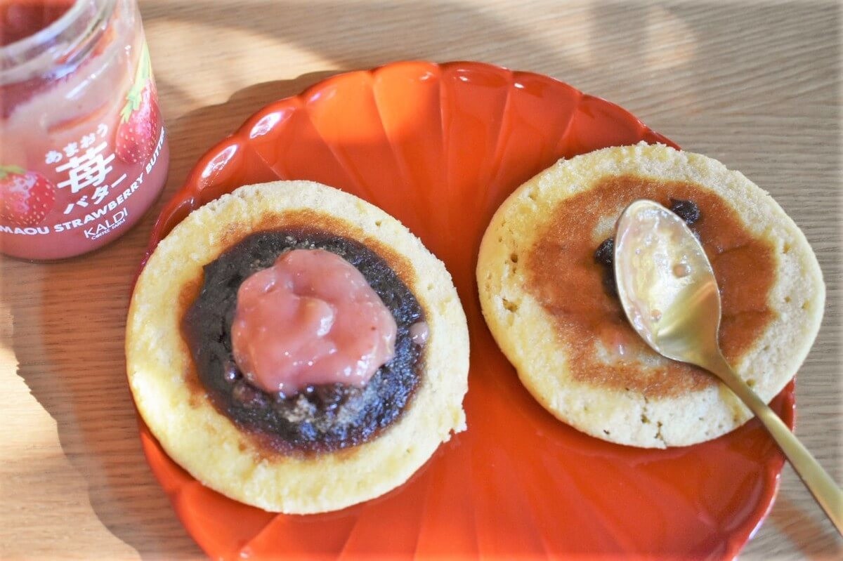 アレンジ①で小豆あんとの相性が抜群とわかり、つぎは「どら焼き」に挑戦です。どら焼きの皮を1枚はがして、小豆あんの上に苺バターをとろりと乗せ、再びサンドします。