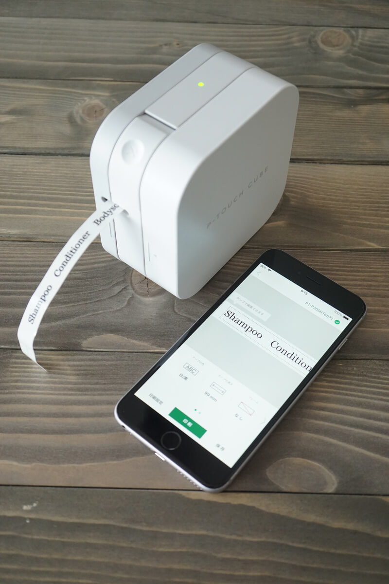 ラベル作りが終わったら、Bluetoothでスマートフォンとピータッチキューブを接続し、スマホの印刷ボタンをタッチすると印刷されたラベルが出てきます。