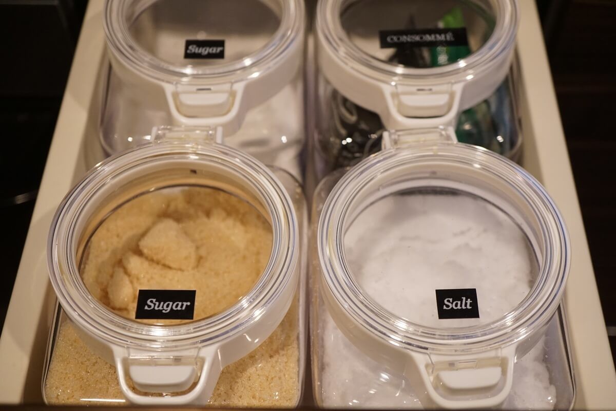 キッチンで使う保存容器や調味料入れも同じ容器を使用しているので、ラベルが欠かせません。
