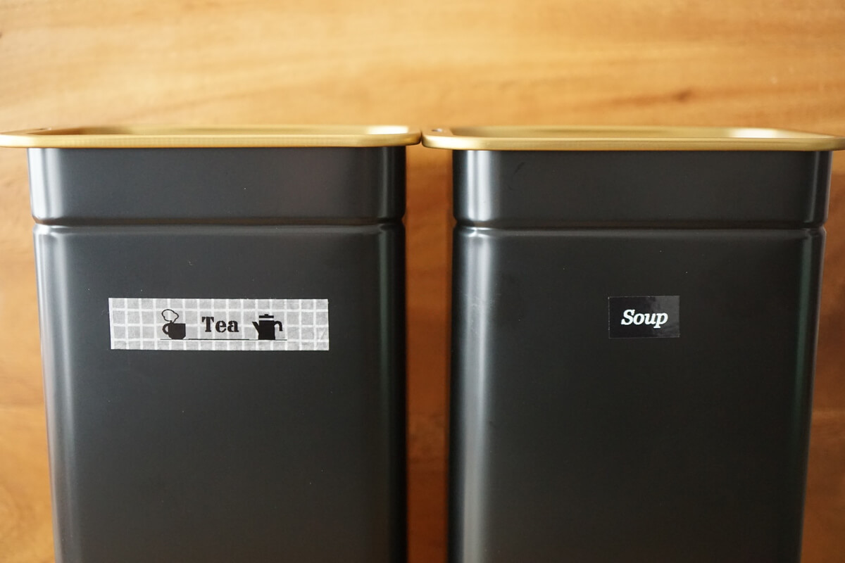 紅茶やスープなどを保存している缶にラベルを貼ってみました。 フレーム入りのラベルを作ってマスキングテープの上に貼り、自分好みのラベルを作るのも楽しいと思います。 文字だけのラベルと比べると、印象が違いますよね。