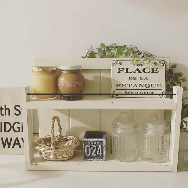 シャビ―仕上げなので、アンティークっぽい小物が好きな方にもおすすめのスパイスラックです。2段になっているので、ジャムやはちみつなどのお気に入りの調味料や小物を、見せる収納でリビングやキッチンを可愛くしちゃいましょう!