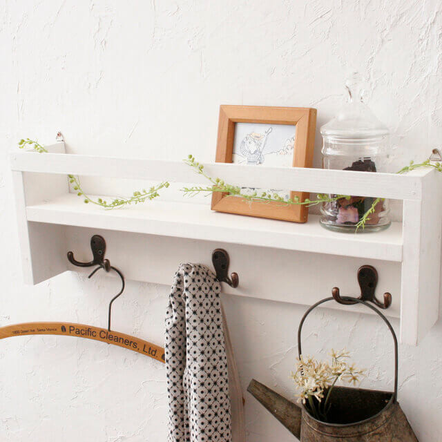 玄関や廊下に物を置きたいときは、壁掛けの収納がおすすめ。木製の壁掛けフック付きシェルフは、ホワイトカラーでどの場所でも馴染みやすいインテリアです。