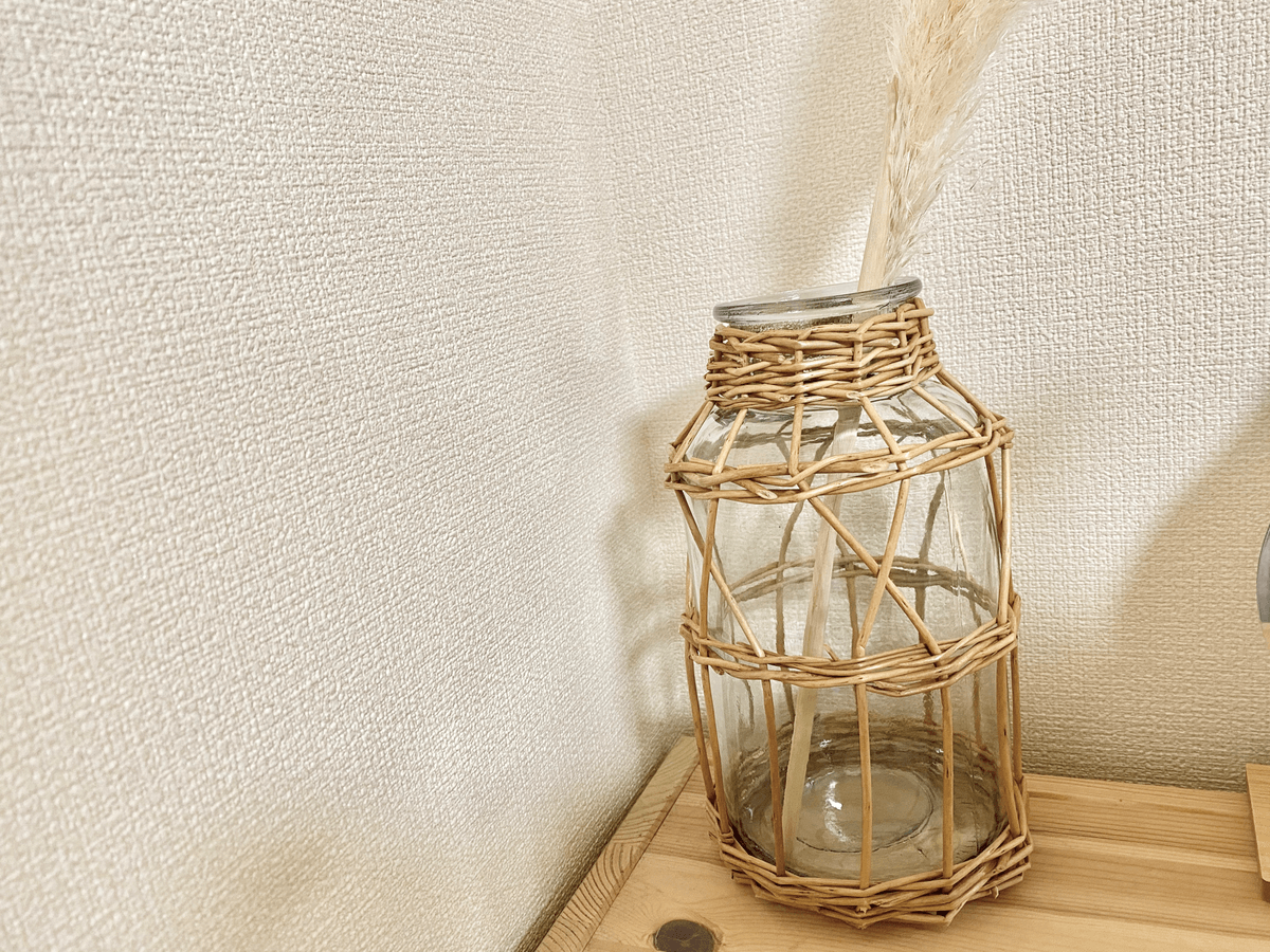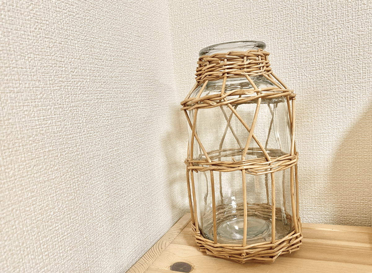 もう一つ購入したのが、こちらの「ガラスフラワーベース(税抜500円)」です。透明なガラスの瓶に、ラタンが編まれているデザインがとってもおしゃれ!