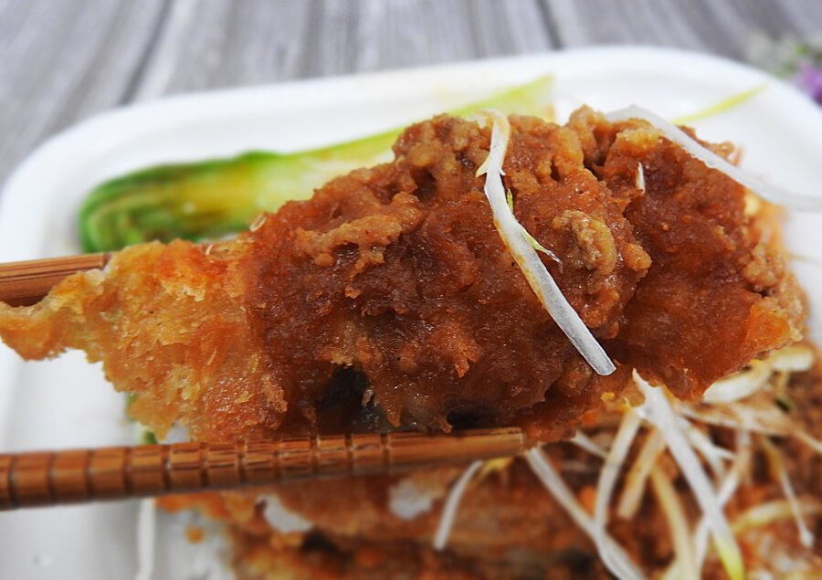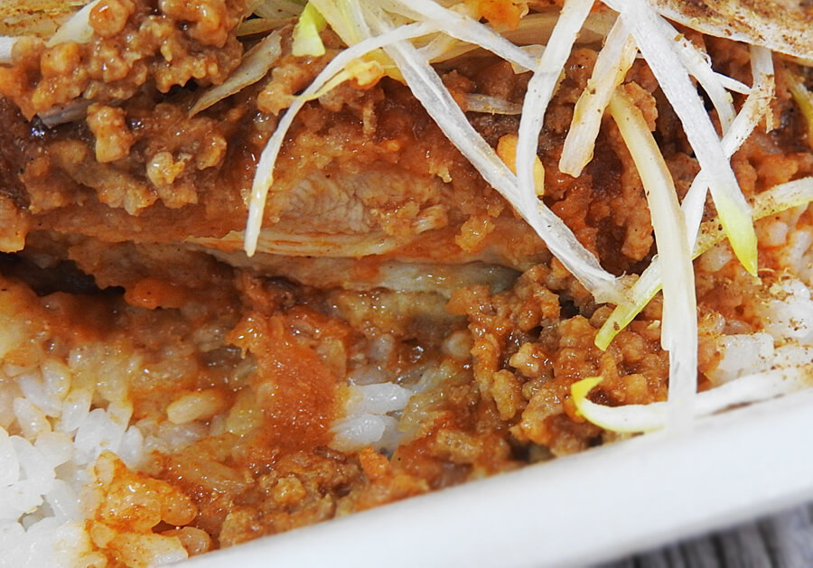 チキンカツはドロドロとしたタレがしっかりとかかっているため、衣はしっとりとしていました。チキンカツはとっても柔らかいですね。かつやのかつ丼に入ってるカツよりも歯切れが良いと思います。ドロドロとしたタレは、麻婆豆腐や麻婆春雨でかかっているような辛みがあります。