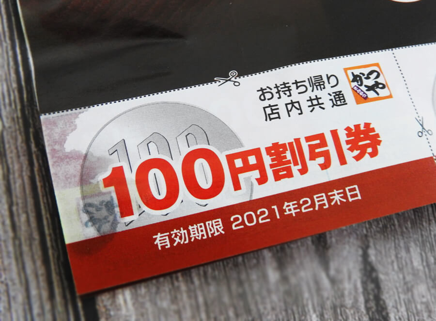 かつやをお持ち帰りした時にもらえるチラシ。うっかり捨てそうになりますが、100円割引券がついていますので、捨てないでください。