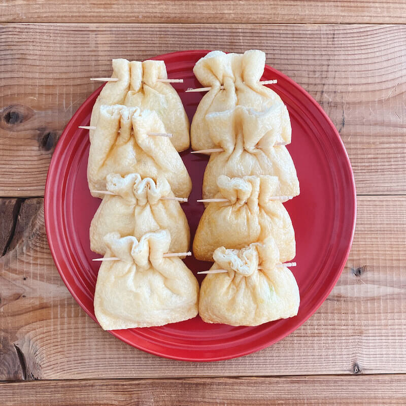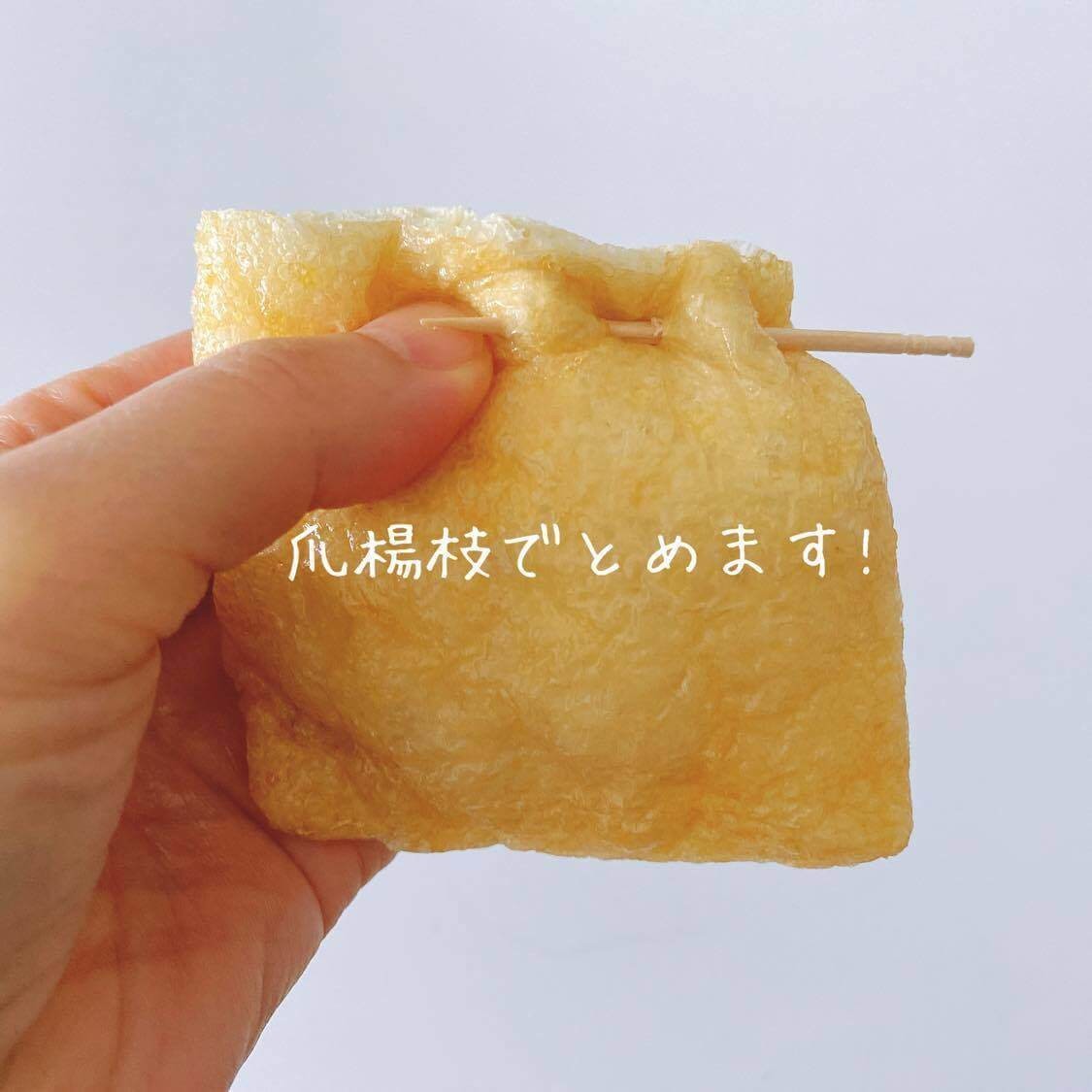 お餅を油揚げに入れて、楊枝でとめます。
