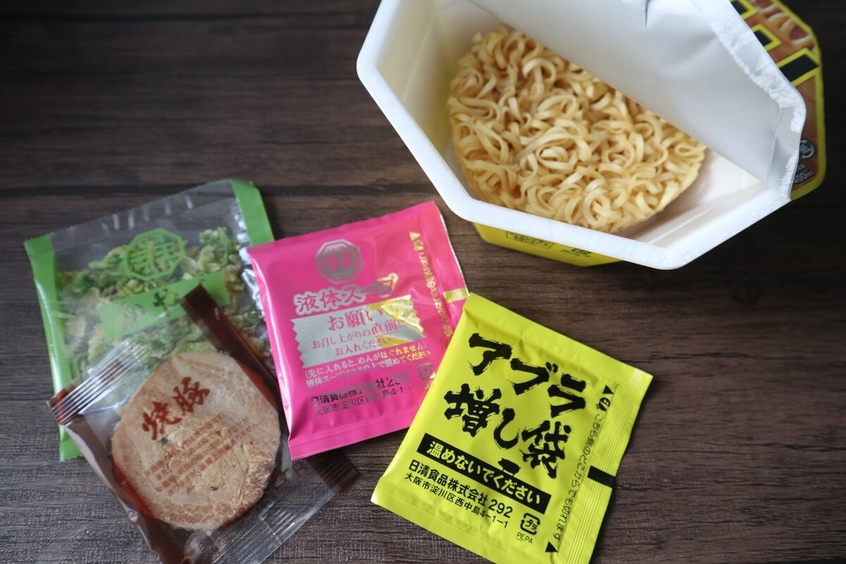 かやく、チャーシュー、脂増し袋、液体スープが入っています。