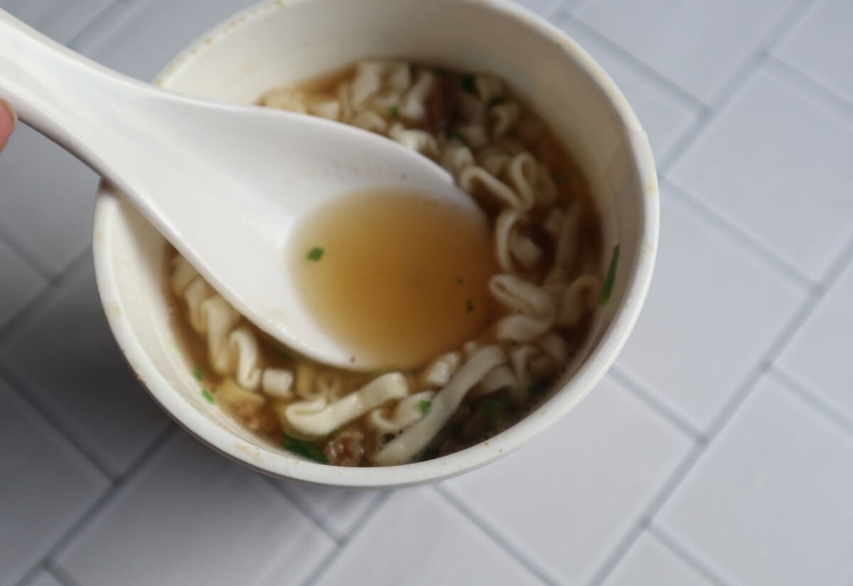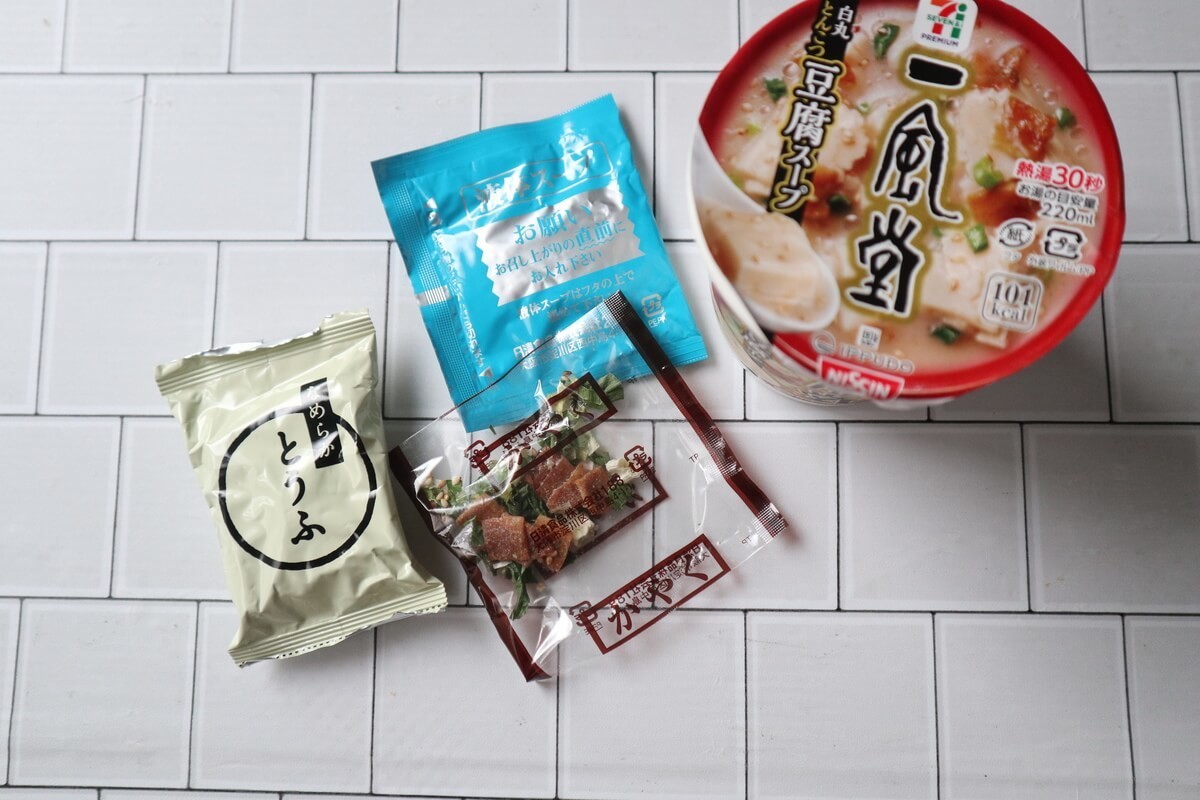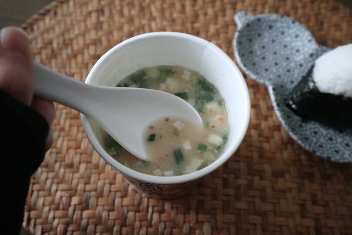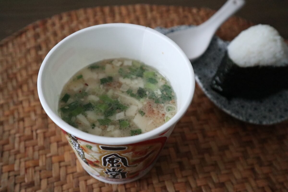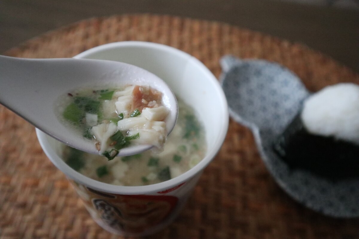 カップに豆腐とかやくを入れてお湯を注ぎ蓋をして30秒ほどたったら、液体スープを入れて混ぜたら完成です。