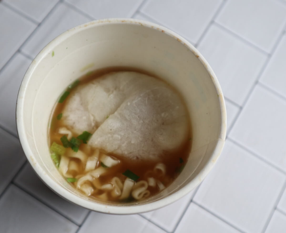 カップの中には液体スープ、豆腐、かやくが入っています。
