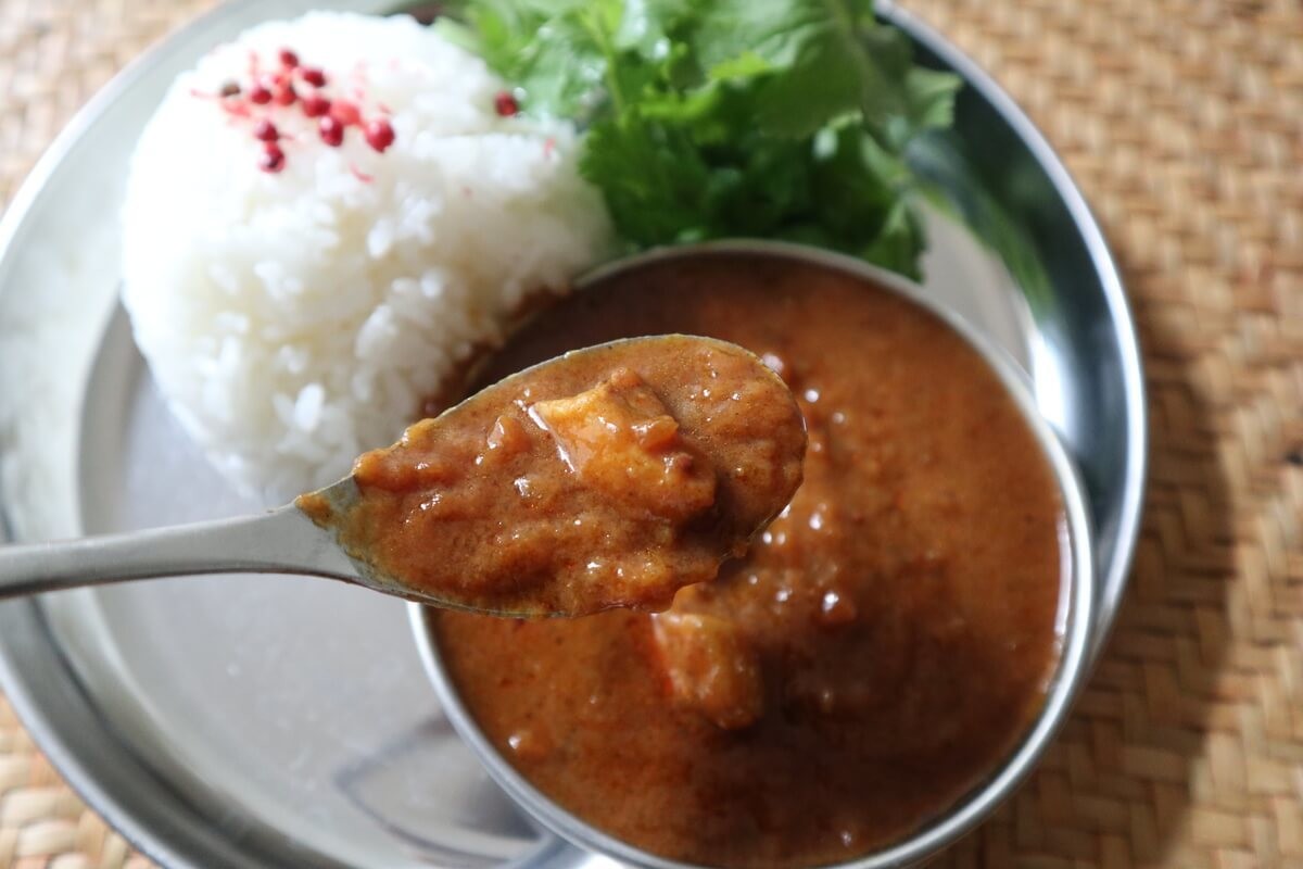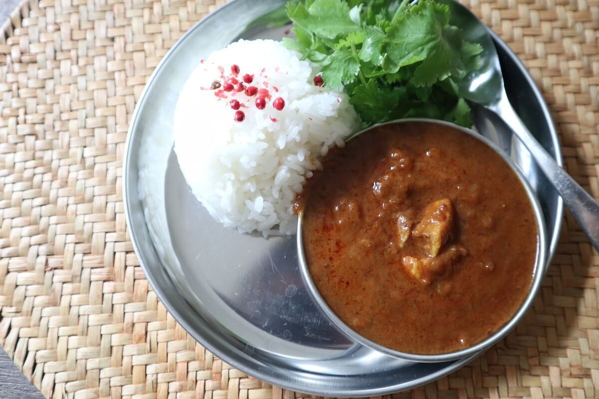 小さいですが豚かたまり肉がゴロゴロ入っています。白ワインビネガーでさっぱりしつつも、スパイスで風味と辛み、豚肉の旨みが入っていてコクもあり、バランスのいいカレーです。