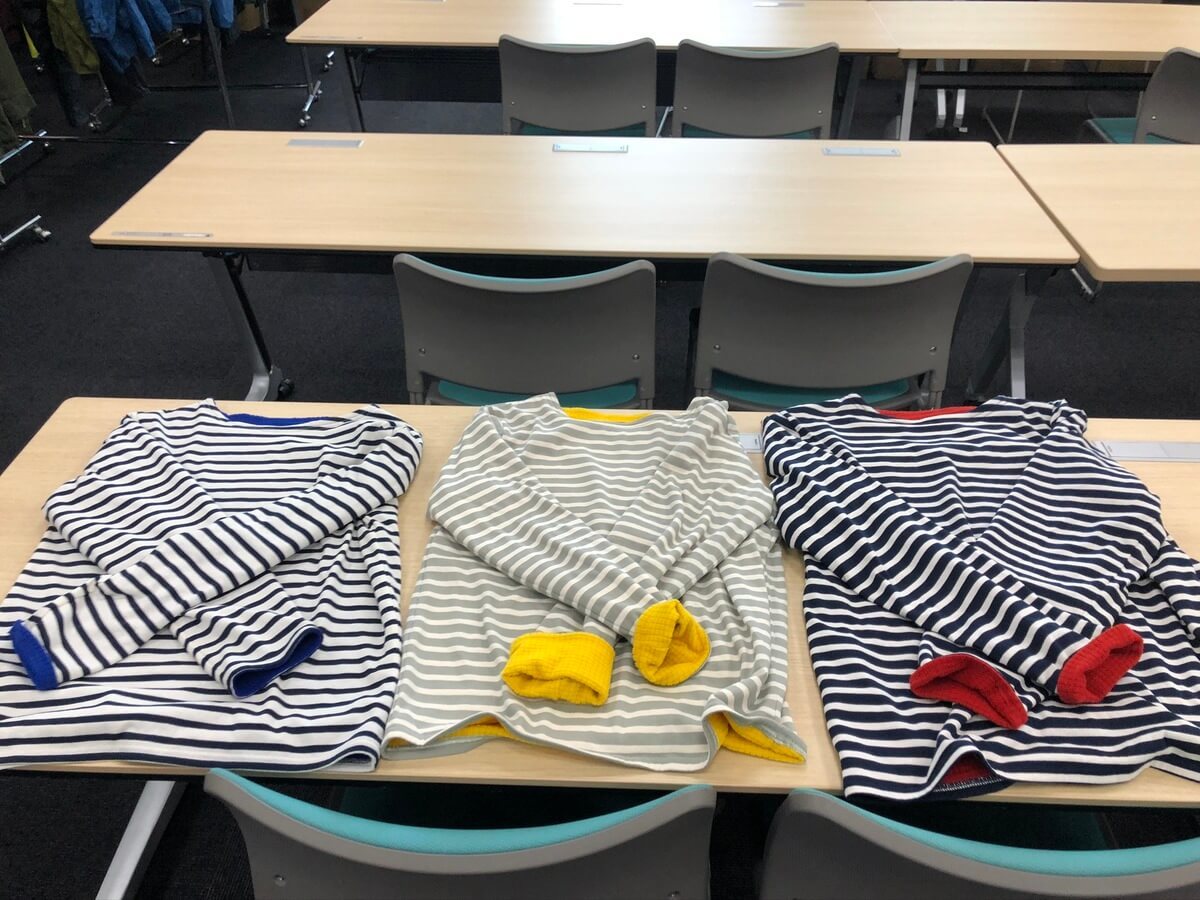 ちなみに写真の左から、グレー、オフホワイト、ネイビー、オフホワイトです。とくに、ネイビーとオフホワイトはデザインは少ししか違わないものの、着ると印象が変わりますよね。