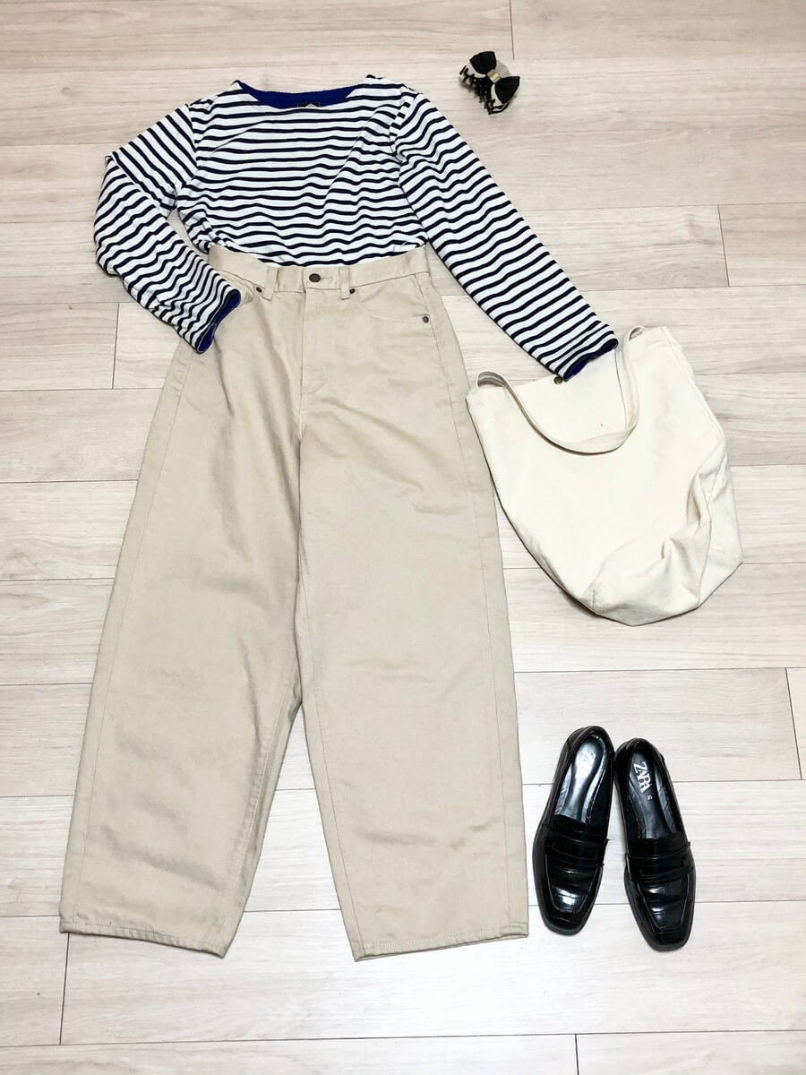 オフホワイトのボーダー服は、パンツとの相性が最高にいいです。