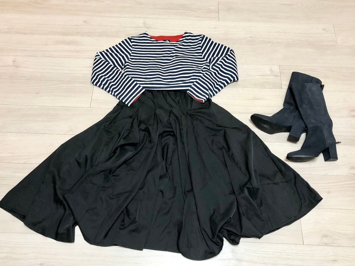黒のフレアスカートと紺のロングブーツを合わせましたが、ボーダーの柔らかさがミックスされ、優しい雰囲気に。