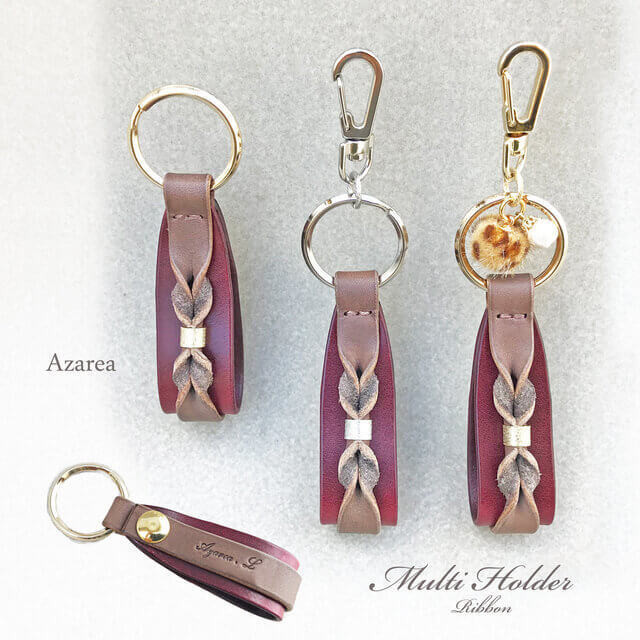 レザーでリボンがあしらわれ、反対側面にはヴィンテージ書体で名入れも可能!金具も2色、チャームは11色とカスタマイズもできるので自分オリジナルホルダーを作れちゃいます。