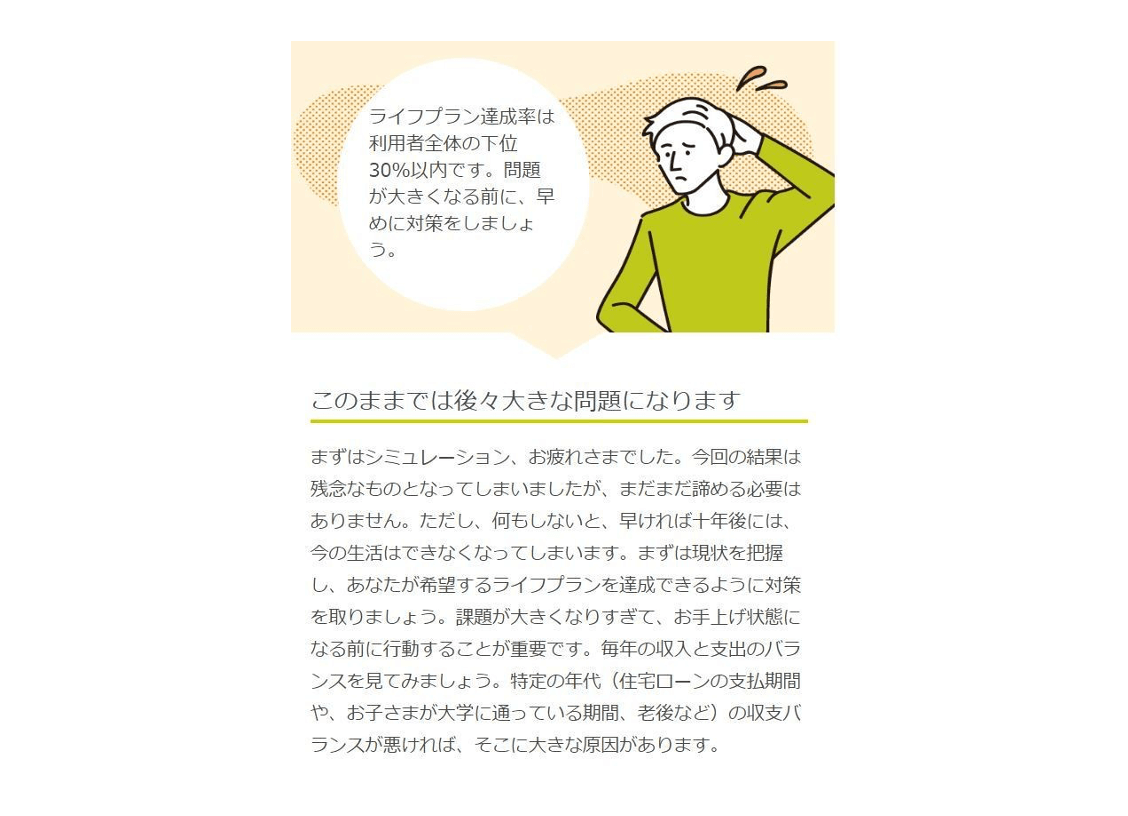 『コーチからのアドバイス』という項目があり、シミュレーション結果に沿った、ていねいなアドバイスが表示されました。コーチの似顔絵イラストつきで、まるで個人相談をしてもらっている感じです。チャットで簡単な質疑応答もできました。外出しにくい今、「オンライン」で相談が可能なのも嬉しいです。(山口さん)
