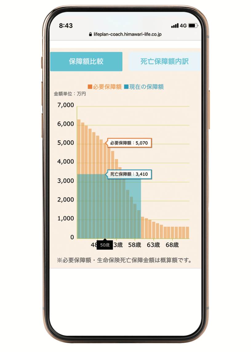 シミュレーションで算出した必要保障額のグラフ上に、生命保険の死亡保障額のグラフを重ねて表示することができ、ご自身のスマートフォンなどから、死亡保障額の過不足を簡単かつ視覚的に確認することができます。