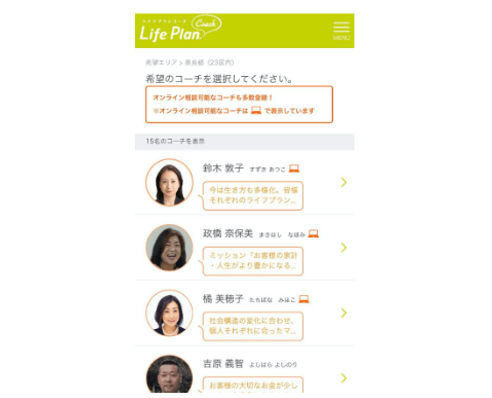 長年地域に寄り添った信頼のコーチ、女性のライフスタイルに詳しいコーチなどが多数在籍。自分に合ったコーチを選び、「初回無料」で相談できます。「オンライン相談」も可能です。