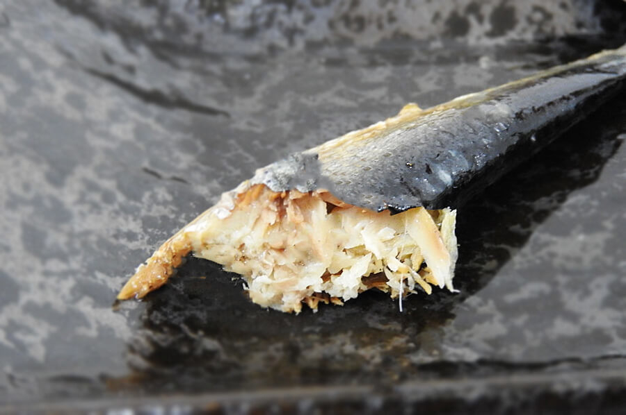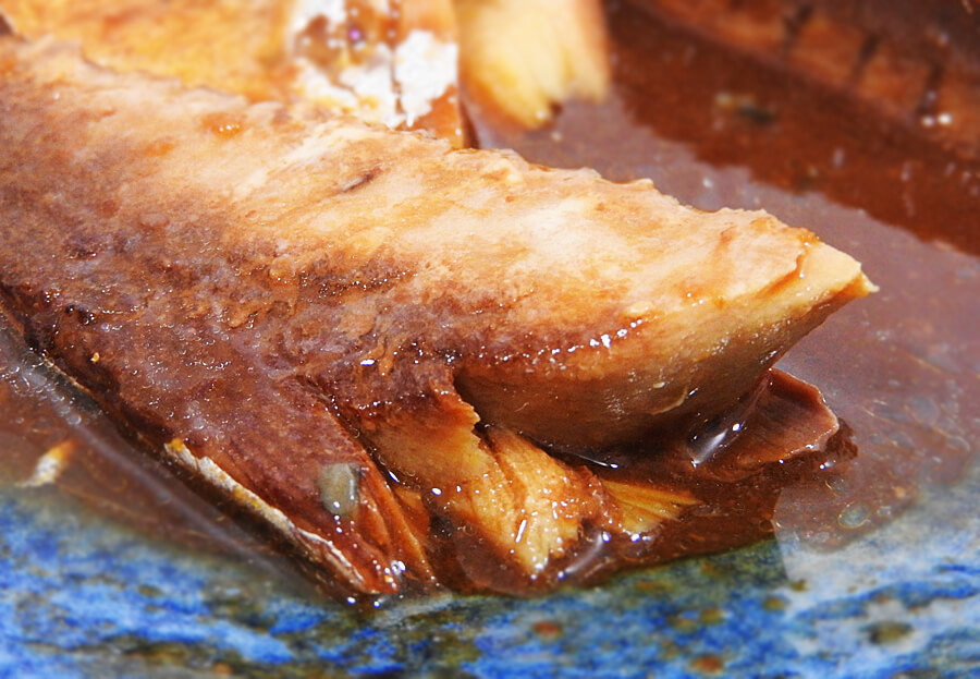 はしですぐに崩せるほどの柔らかさ。鯖の中側まで味噌の色をしていて、味噌が鯖に浸透しているのがわかります。鯖の身はパサつきはないものの、小骨が気になります。上で紹介したいわしとは異なり、小骨を取り除きながら食べないといけないのはちょっと面倒かな。