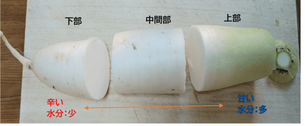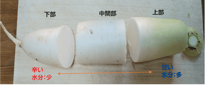 大根の上部は甘く、根本の下部にいく程、辛くなります。