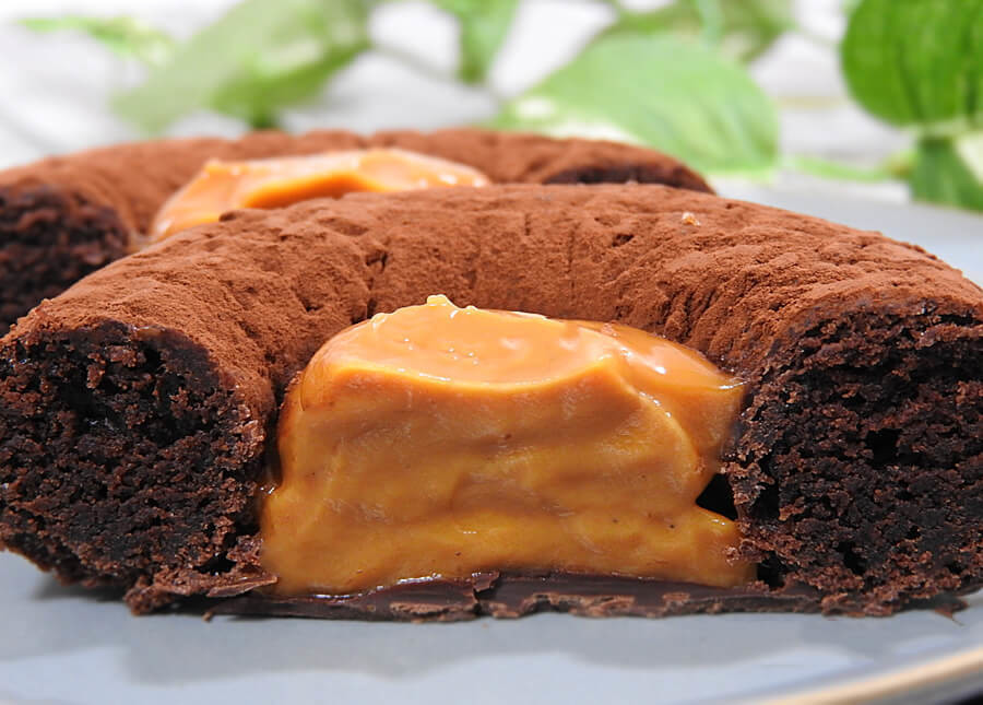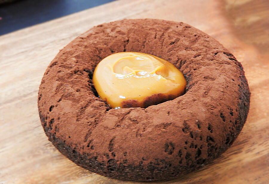 ミスド「フォンダンショコラドーナツ キャラメル」は、濃厚なチョコレートドーナツ生地に塩キャラメルクリームが入っています。ドーナツ表面にがココアパウダーがかかっていますよ。