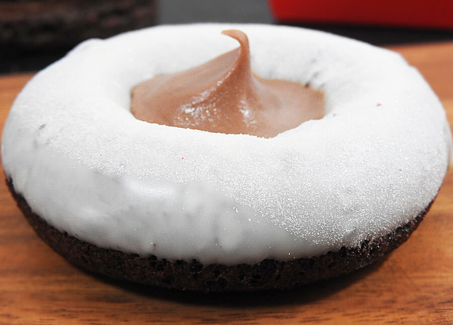 写真では境目がわかりにくいんですが、ガナッシュホイップの下にヘーゼルナッツクリームが入っています。すこし下にざらつく感じがありますが、もったりとしたクリーム。マイルドな甘みとカカオの風味がきいているドーナツ生地との相性が絶妙でした。