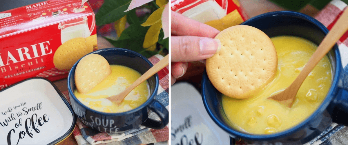 コーンスープに浸すと、サクサクの「マリー」がまるでパンのように柔らかい食感になり、朝食にぴったりです。(つくもはるさん)