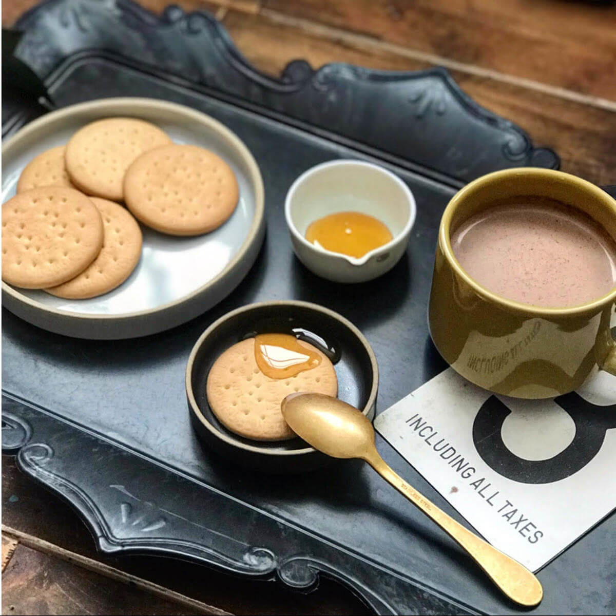ホットミルクで作ったココアで、とことん“懐かしい”味わいを追求してみました。「マリー」に、ちょっぴり蜂蜜をかけてもおいしいですよ。(@chocolate.caféさん)